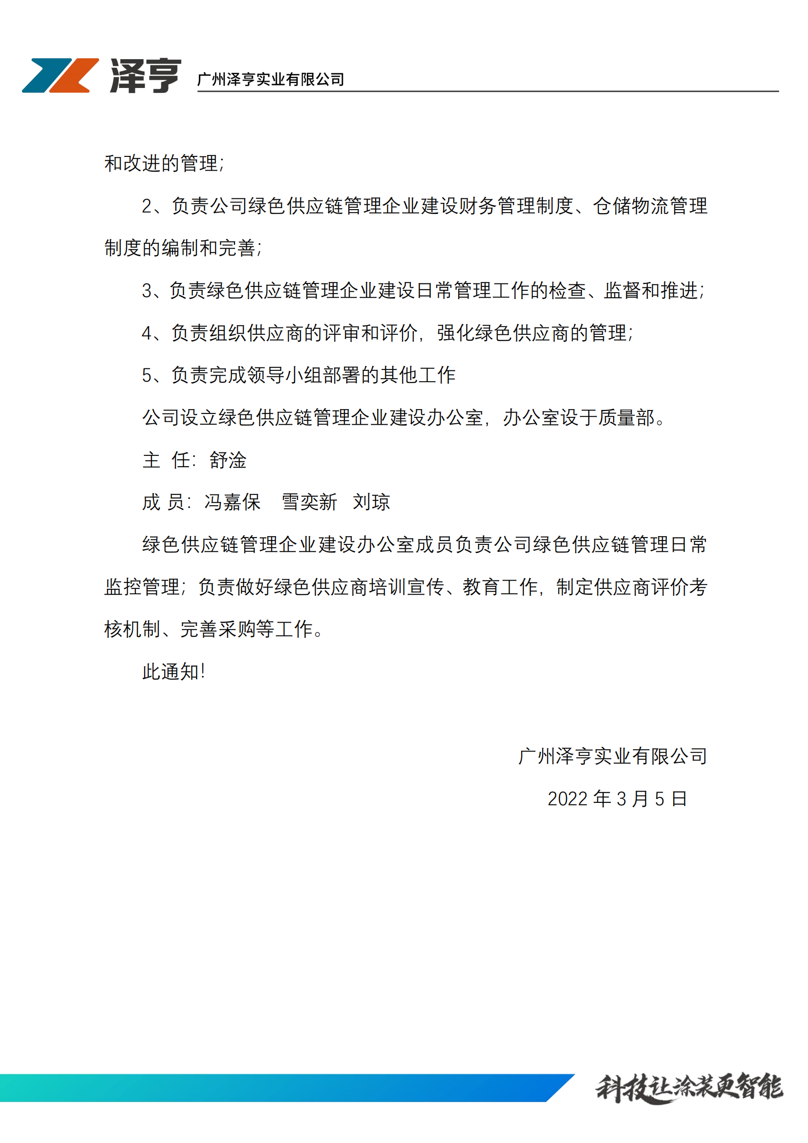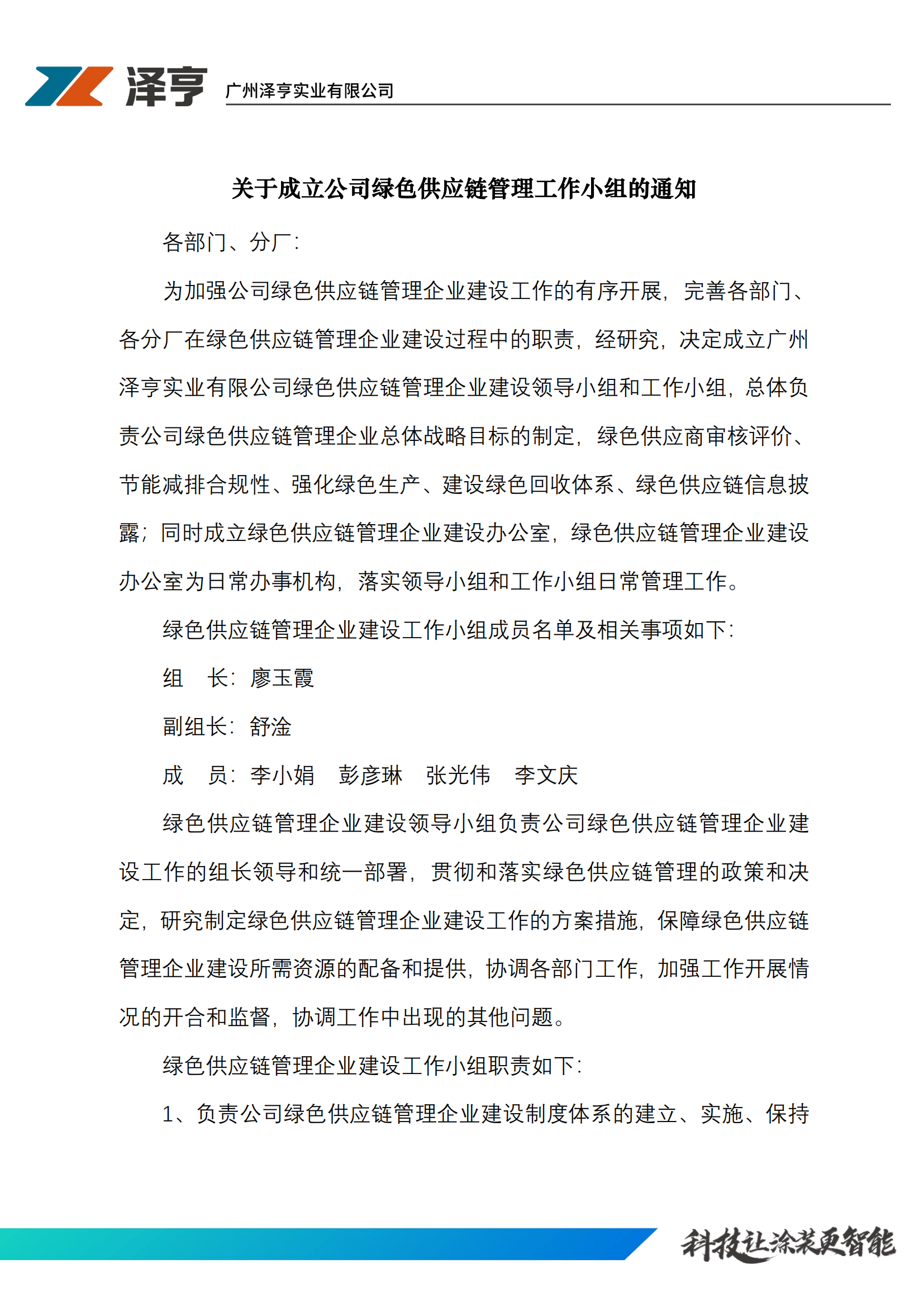 關于成立公司綠(lǜ)色供應鏈管理(lǐ)工(gōng)作(±Ω ₩zuò)小(xiǎo)組的(de)通(tōng)知(zhī)
